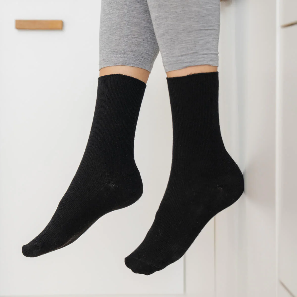 Freedom for your feet, relief for swelling and pain, and a gentle ribbed texture that keeps them in place without cuffs. Our sensitive socks in wear-with-anything black tick all the boxes.